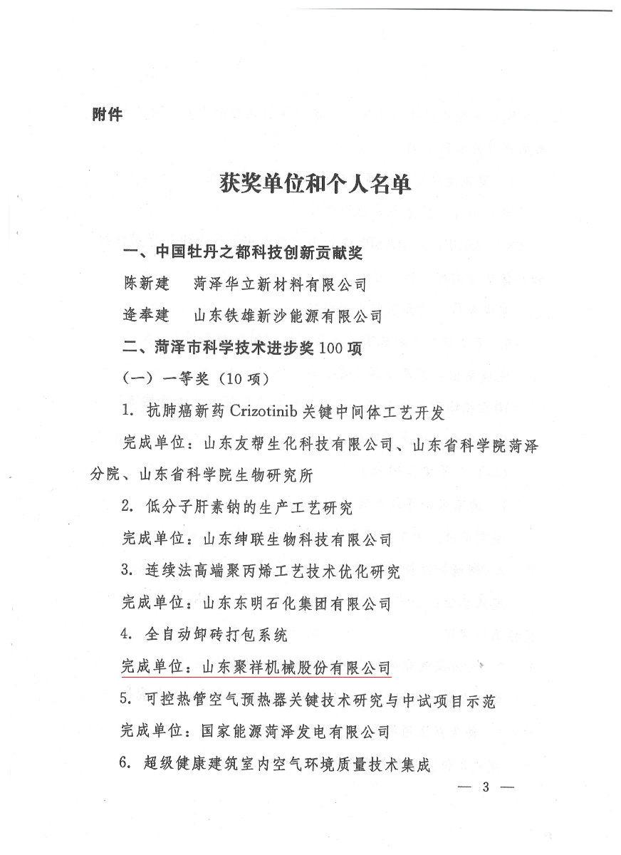 聚祥全自動(dòng)卸磚打包機(jī)被評(píng)為菏澤市科學(xué)技術(shù)一等獎(jiǎng)