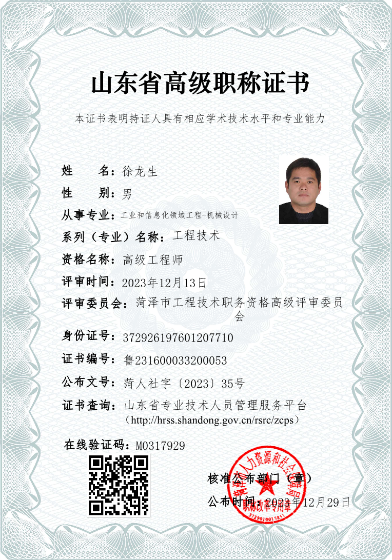 徐龍生同志榮獲“山東省高級工程師”榮譽稱號